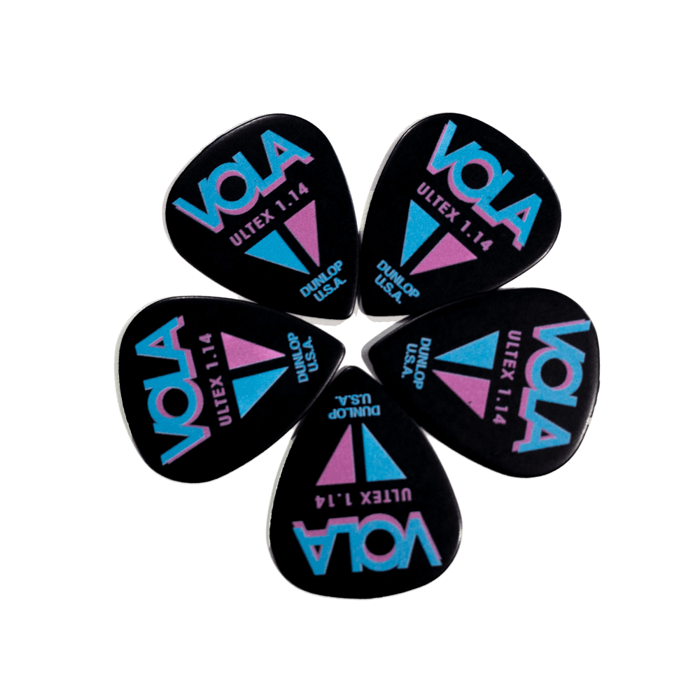 Custom Dunlop Ultex 1.14mm guitar picks with VOLA Logo.